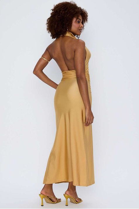 Modelo Veste P • Modelagem justa ao corpo • Abertura nas costas com fecho no pescoço • Detalhe drapeado lateral